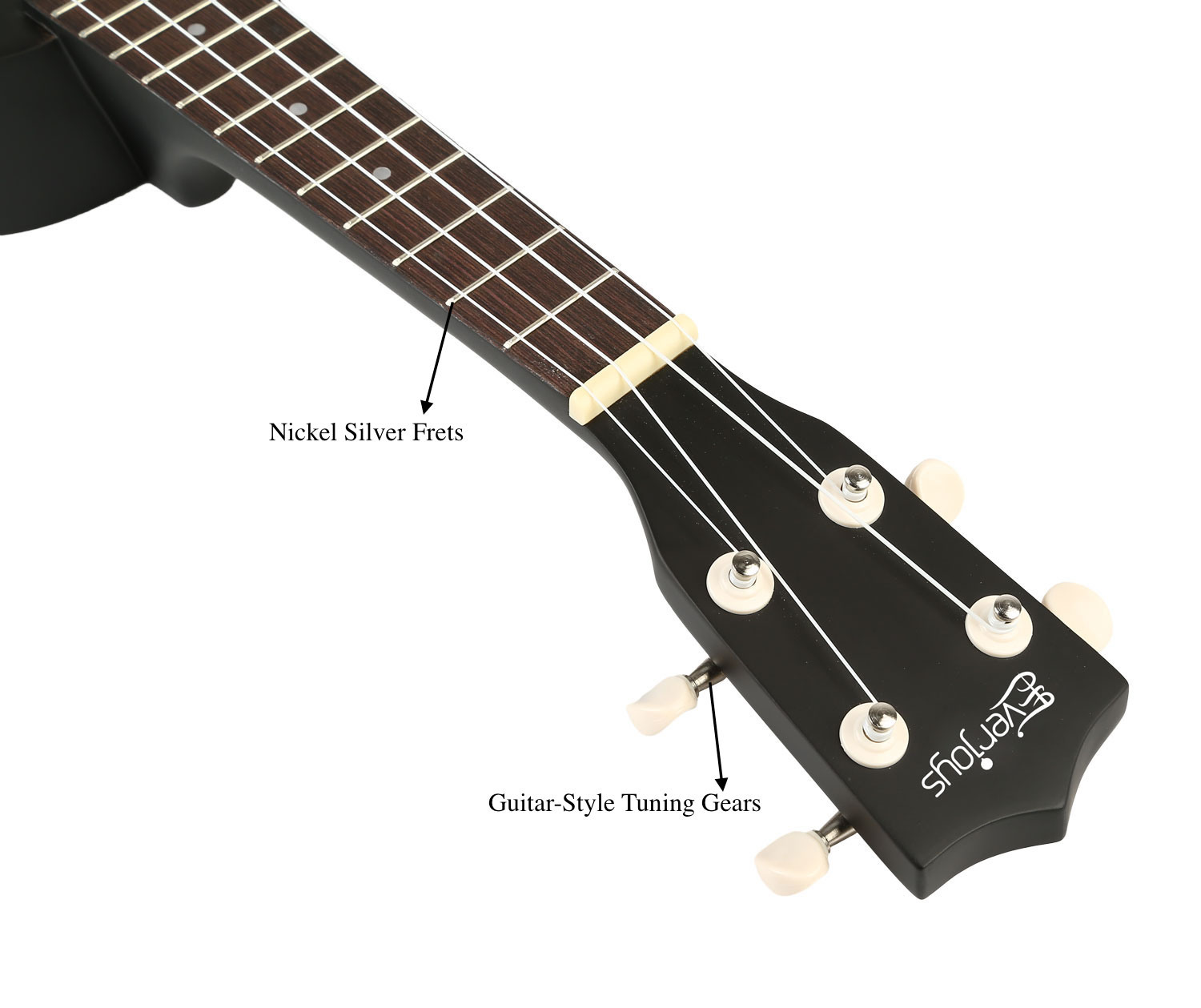 します習得が簡単:演奏に多くの時間を費やし、チューニングにかける時間を減らします!正確で滑らかな、クロームメッキのギタースタイルチューナー。ウクレレを常に調整します。12のニッケルシルバーフレットと、正しいフレットのポジショニング、5番、7番、10番のフレットのネック、指板の上部